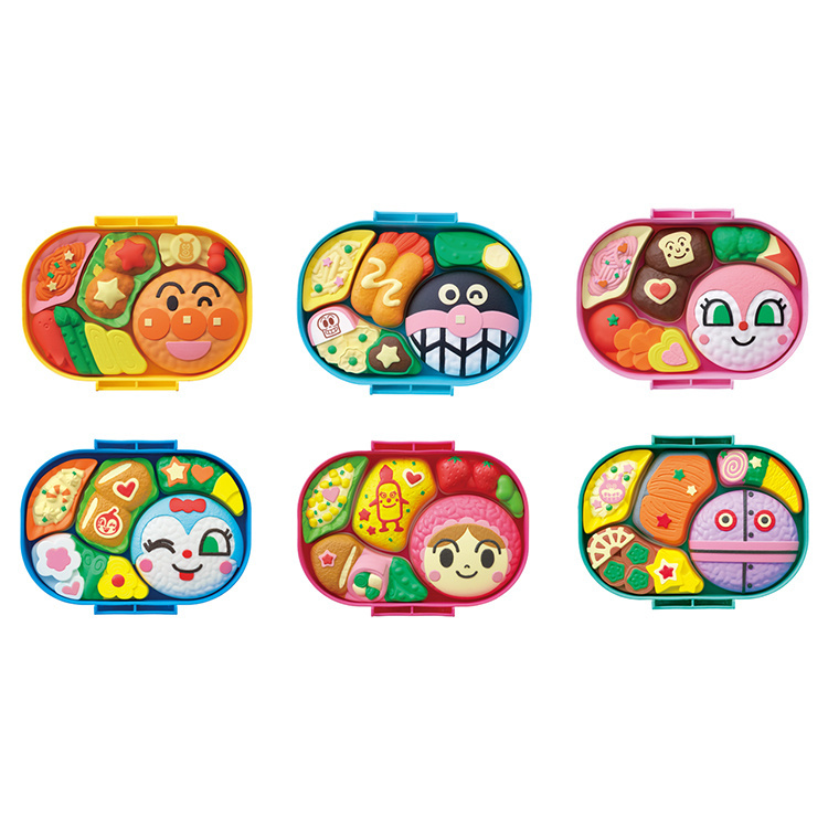 アンパンマン(からあげ弁当)、ばいきんまん(エビフライ弁当)、ドキンちゃん(ハンバーグ弁当)、あかちゃんまん(オムレツ弁当)、だだんだん(シャケ弁当)、コキンちゃん(カツ弁当)のかわいいお弁当を作ることができるおべんとうパズル。