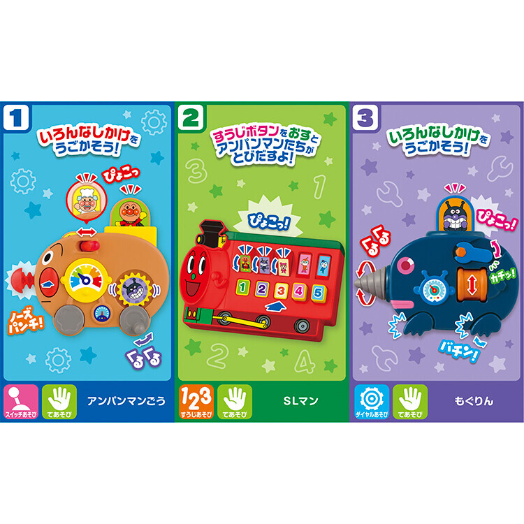 ラインナップは「アンパンマンごう」「SLマン」「もぐりん」の全3種です。