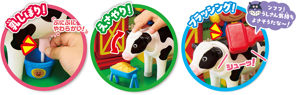 「うしさんのお乳をしぼってね!」「うしさんおいしい牛乳ありがとう!」など、アンパンマンたちがどんどん話しかけてくれるよ。
