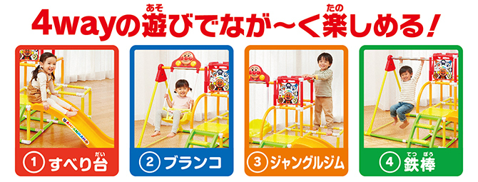 すべり台、ブランコ、ジャングルジム、鉄棒の4WAYで長く遊べる室内遊具です。