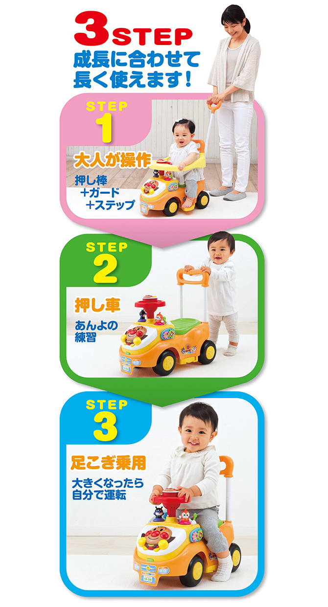 あんよの練習に押し車として、ステップをしまえば足こぎ乗用として自分で運転も!