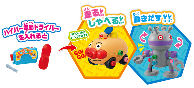 完成したアンパンマンごうやだだんだんにハイパー電動ドライバーを入れるとおしゃべりや様々な動きが楽しめるよ。