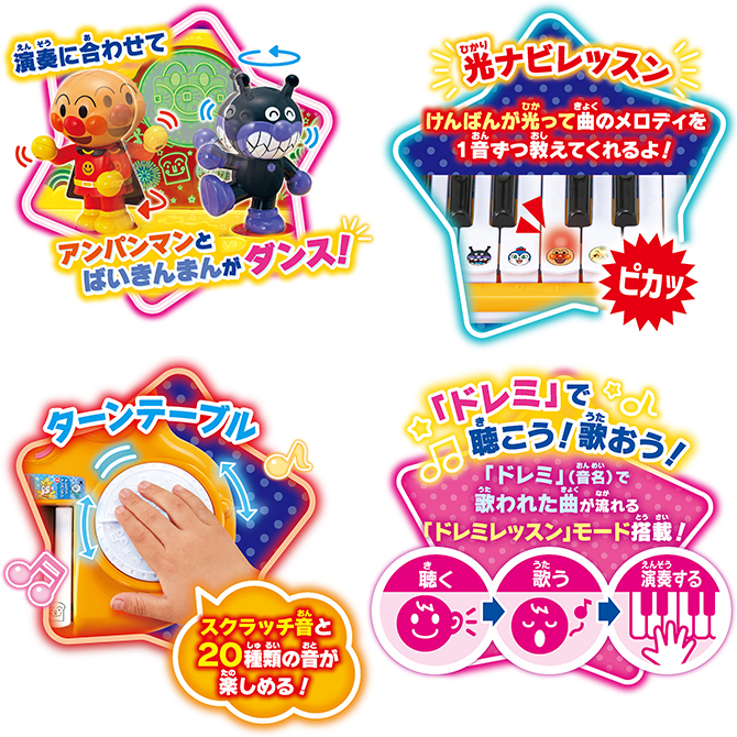 どの鍵盤を押しても簡単に曲が弾ける「光ナビレッスン」や、ドレミで歌われた曲を聴いて・歌って・演奏する「ドレミレッスン」など成長段階に応じて楽しく演奏できます♪