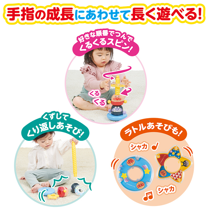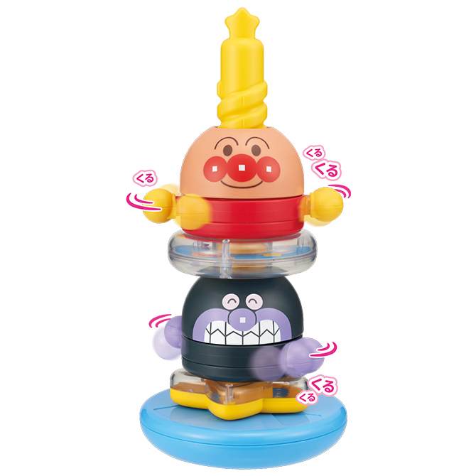アンパンマンやばいきんまんのパーツをおほしさまスティックにはめると、くるくる回りながら落ちていく、成長に合わせて遊べるスタッキングトイです。