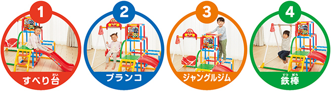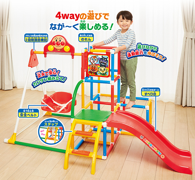 ブランコ・ジャングルジム・すべり台・鉄棒の4WAYで長く遊べる室内遊具!