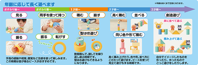 握る、振る、転がる、はめる、並べる、積むなどの動作を通してお子様の手指の発育を促し、成長に合わせて長く遊ぶことができます。