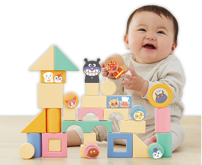 アンパンマンとばいきんまんの形をした音入りピースなど、優しいカラーのつみきが33ピース入っているよ☆