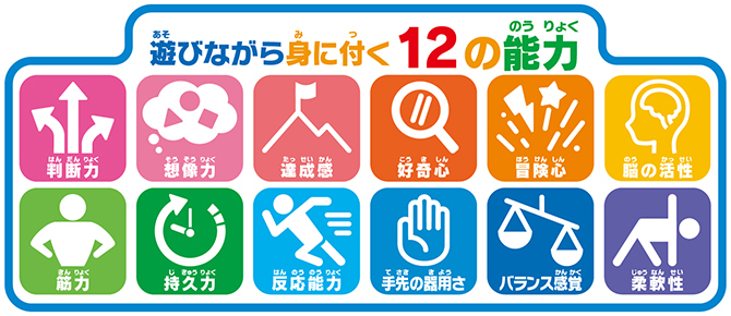 遊びながら判断力、想像力、好奇心、脳の活性、反応能力、手先の器用さ、バランス感覚、柔軟性など12の能力を伸ばすことができます!